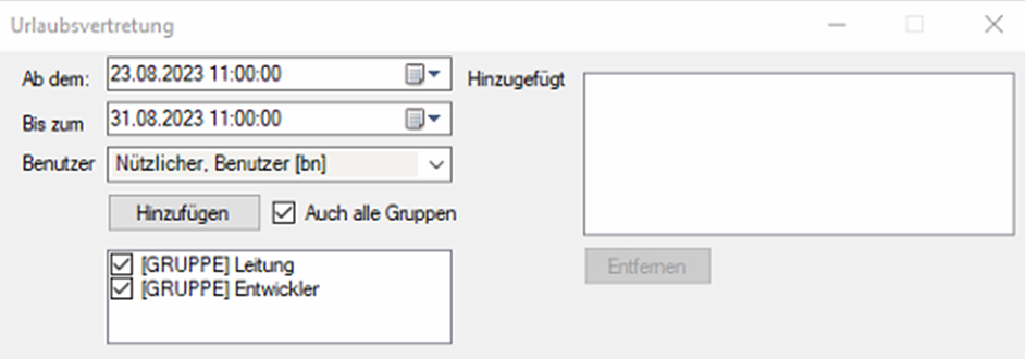 Mit dieser Funktion können Sie eine Urlaubsvertretung in einem gewissen Zeitraum hinzufügen.